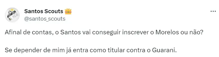 Segundo o Diário do Peixe, Morelos está 100% recuperado da lesão que tinha na panturrilha e após a regularização junto à CBF, está apto a fazer sua reestreia contra o Guarani, já no próximo domingo (4), na Vila Belmiro.