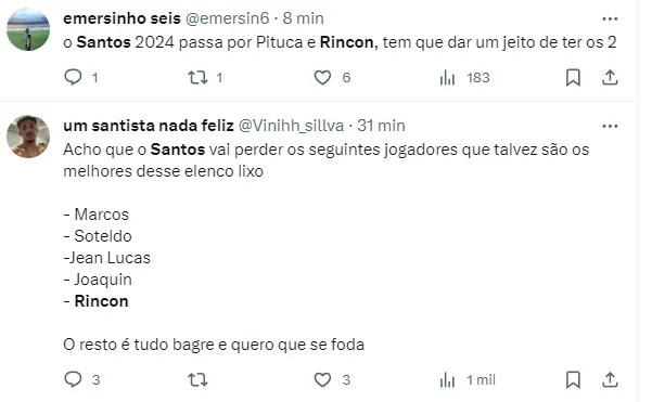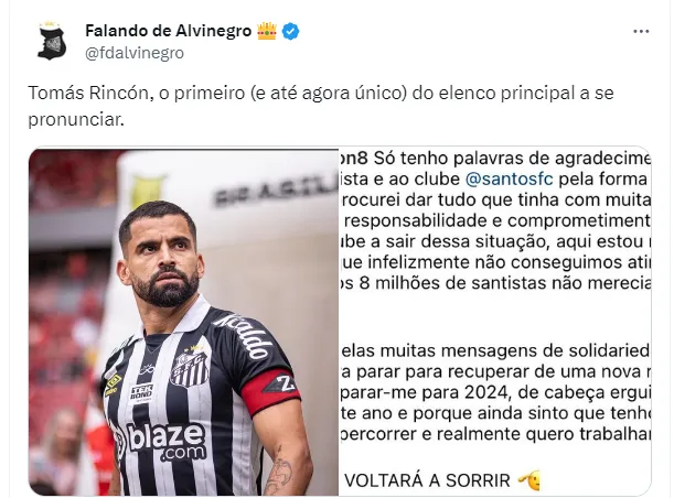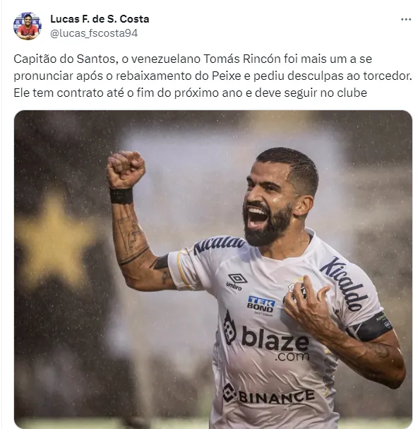 “Capitão do Santos, o venezuelano Tomás Rincón foi mais um a se pronunciar após o rebaixamento do Peixe e pediu desculpas ao torcedor. Ele tem contrato até o fim do próximo ano e deve seguir no clube”, publicou o jornalista.