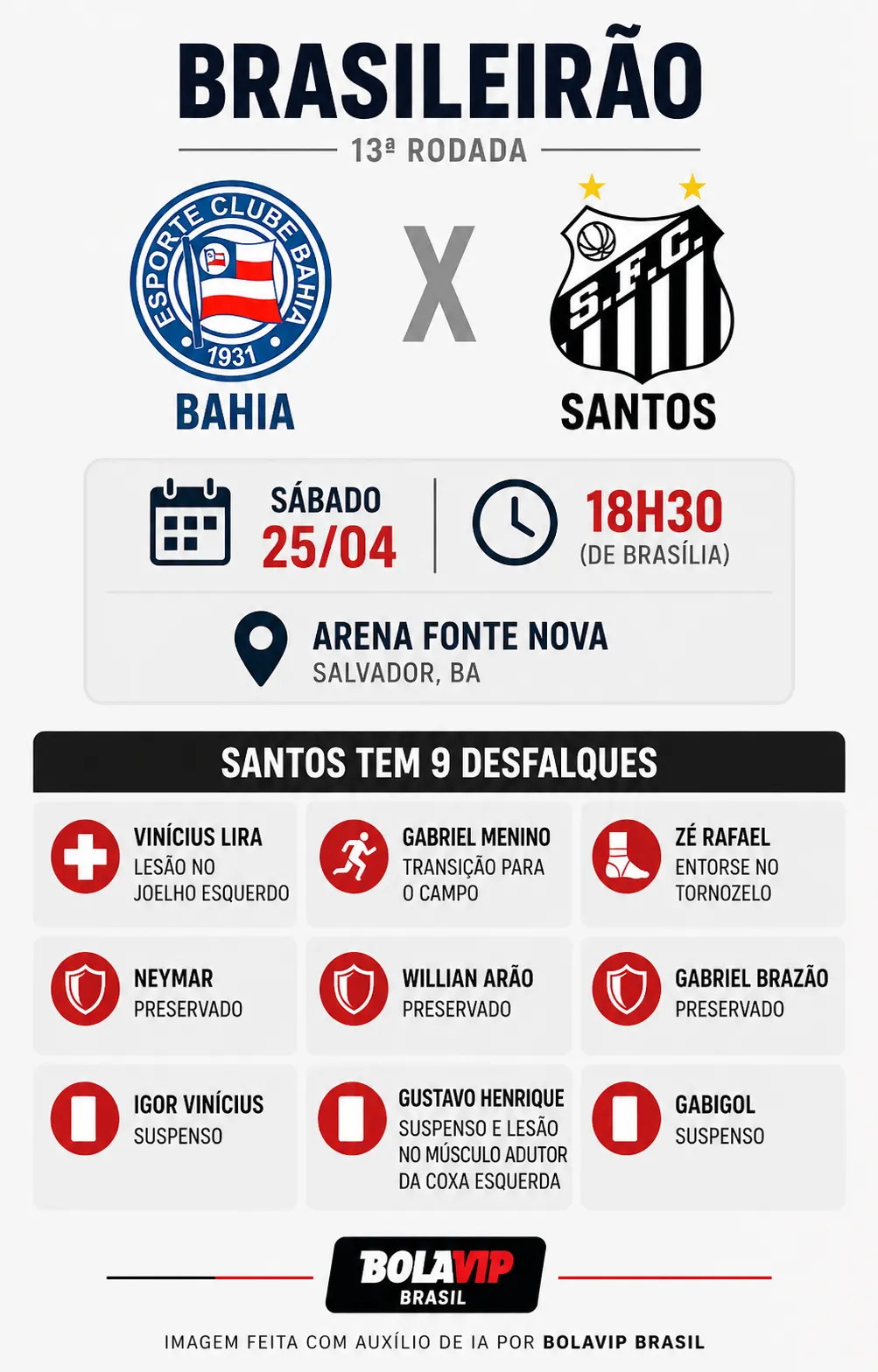 O Santos entra em campo neste sábado (25) com desfalques importantes para enfrentar o Bahia. Em função da intensa maratona de jogos, a comissão técnica optou por preservar alguns jogadores. Além de Neymar, Gabriel Brazão e Willian Arão também não foram relacionados.