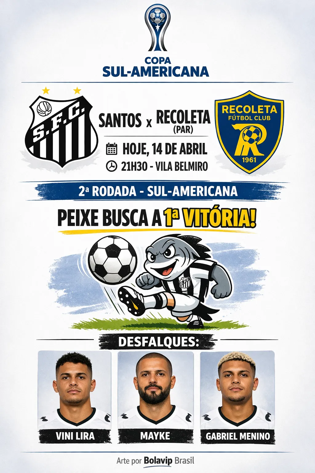 Finalizando a preparação para mais um desafio na Sul-Americana, o Santos possui três desfalques para enfrentar o Recoleta, do Paraguai, nesta terça-feira (14), na Vila Belmiro. Cuca não poderá contar com Vini Lira e Gabriel Menino, que seguem em recuperação no DM.