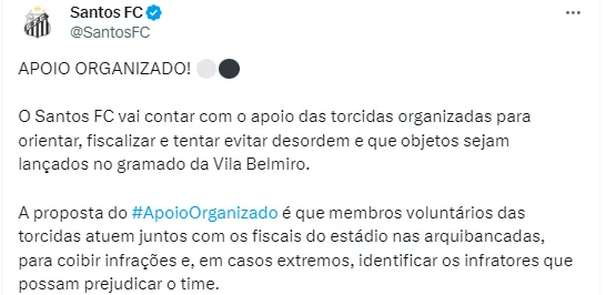 Por isso, o Alvinegro Praiano, temendo novos episódios que podem ser alvos do STJD, decidiu se antecipar. Sendo assim, através de suas redes sociais, o Peixe anunciou o Apoio Organizado, em que vai contar com a ajuda de torcidas organizadas para inibir comportamentos que possam vir a prejudicar. Alguns voluntários vão orientar, fiscalizar e tentar evitar desordem e que objetos sejam lançados no gramado da Vila Belmiro.