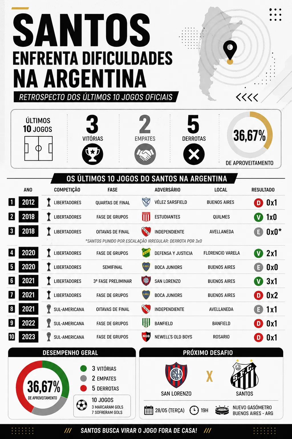 Para conseguir sua primeira vitória na competição continental, o Peixe busca melhorar seu desempenho recente atuando na Argentina. Nos últimos dez jogos, foram apenas três vitórias, além de dois empates e cinco derrotas, conseguindo um aproveitamento de 36,67% em terras argentinas no período.