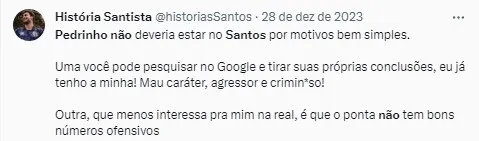 “Santos inicialmente recuou sobre Pedrinho e não existe a certeza da vinda, estamos apurando mais detalhes, mas tudo indica que não vem”, informou o comunicador Alef Santos, que cobre o Peixe.