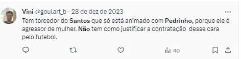 O fato é que isso pode não ter pesado para que a diretoria recuasse na contratação, mas a pressão feita pelos santistas foi alta para que o jogador não vestisse a camisa do Santos em 2024.