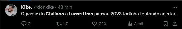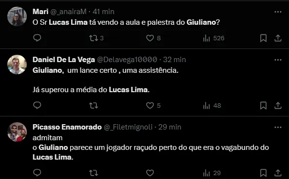 “O passe do Giuliano o Lucas Lima passou 2023 todinho tentando acertar”, “O sonho do Lucas Lima é acertar um passe desse aí que o Giuliano acertou”, “Tem uns cinco anos que o Lucas Lima não acerta um passe que o Giuliano deu pro Otero” e “O Sr Lucas Lima tá vendo a aula e palestra do Giuliano?”, disseram.
