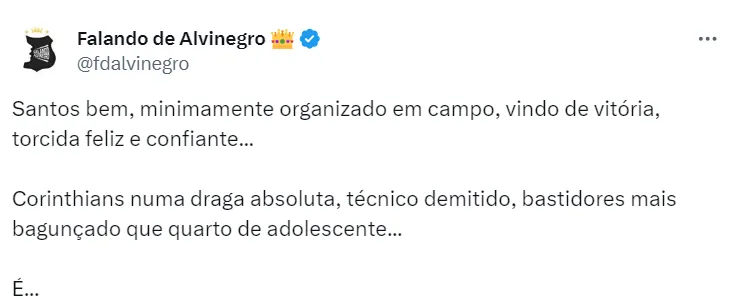 Enquanto o Santos demonstra uma evolução com o novo elenco, o Corinthians também tenta se reestruturar, mas encontra dificuldades dentro e fora de campo. Neste momento, o Timão é o vice-lanterna na classificação geral.