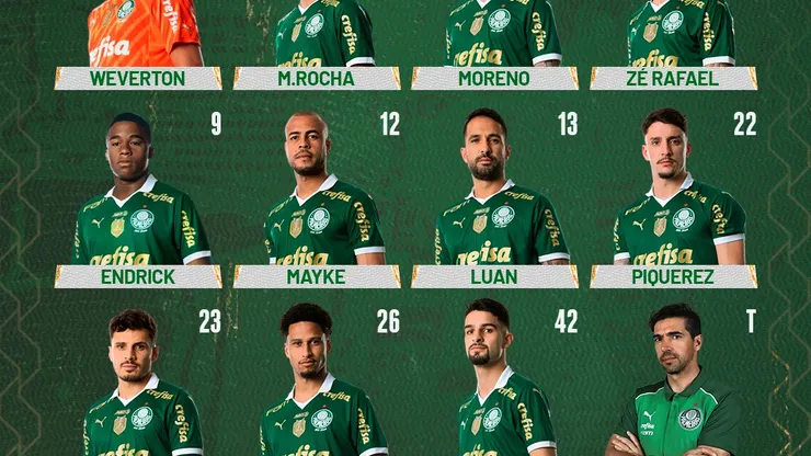 Os escolhidos de Abel Ferreira são: Weverton, Marcos Rocha (C), Luan, Murilo, Piquerez e Mayke; Moreno, Zé Rafael e Raphael Veiga; Endrick e Flacko López