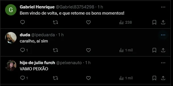 Por outro lado, torcedores avaliam a mais nova contratação, com alguns até pedindo o mesmo desempenho apresentado por Jorge em 2019, quando vestiu a camisa do Santos pela 1ª vez: