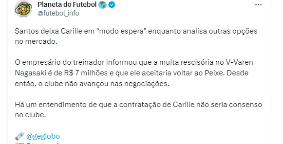 Não é segredo para ninguém quem era a preferência da cúpula santista. O desejo sempre foi que Fábio Carille, à frente da equipe em 2021 e 2022, voltasse ao Alvinegro Praiano. No entanto, o treinador tem vínculo com o V-Varen Nagasaki, do Japão, e apesar de demonstrar o desejo de regressar ao Peixe, seu estafe informou o Santos que o valor da multa rescisória para tirá-lo da equipe asiática é de R$ 7 milhões,.