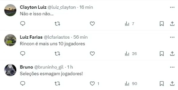 “Como Rincon faz falta. A volancia do Santos é praticamente inexistente. os caras chegam mano a mano com nossa zaga”.