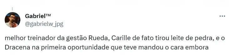 “Sobre a diretoria, eu não tive discussão nem nada, mas desde que o Edu Dracena chegou eu sabia que ele não ia me querer lá. No futebol a gente fica sabendo de tudo e ele não queria desde o início. E a prova disso foi que desde a minha chegada não chegou nenhum jogador. Foi eu sair que chegaram vários jogadores”, contou Carille.