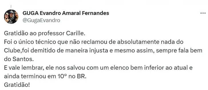 “Eu não levantei taça no Santos, mas eu considero o meu melhor trabalho. O trabalho mais difícil. Peguei no final faltando 18 rodadas com o time na zona do rebaixamento e sem poder contratar. Muitos jovens que não estavam prontos. Aí você termina em 10º”, completou.