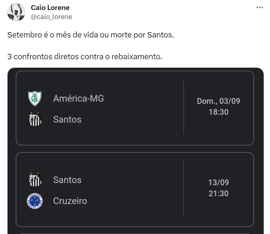 Na próxima rodada do Brasileirão, o time de Aguirre enfrenta o lanterna América-MG, em Belo Horizonte. Depois, o Clube da Vila Belmiro desafia o Cruzeiro na Vila Belmiro e na sequência visita o Bahia em Salvador. Já na 25ª rodada do Brasileirão, o Peixe recebe o Vasco em casa. Todos esses jogos são confrontos diretos na luta contra o Z-4.