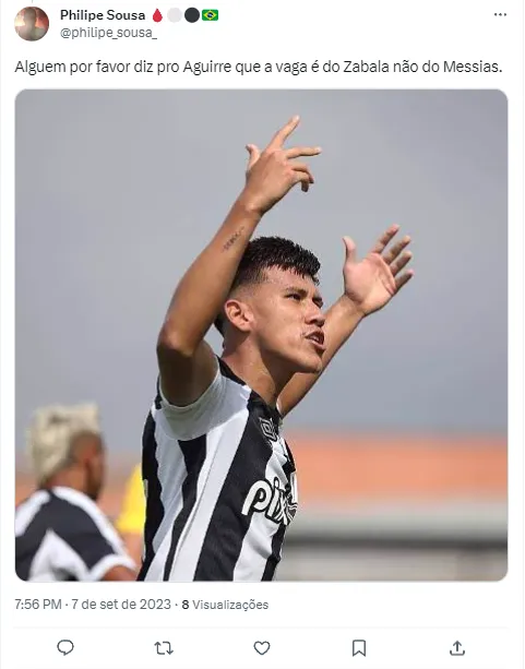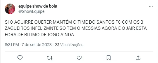 Segundo a torcida do Santos, Aguirre deveria dar chances ao garoto Jair, de apenas 18 anos. Destaque no Sub-20 do Peixe, dono de uma estatura de 1,95 metros, o menino da Vila Belmiro é o nome preferido para ocupar o local deixado por Alex, enquanto que um outro atleta recebe pedidos para que o técnico uruguaio não escale. A moral de Messias anda estremecida com os santistas e deu para ter uma noção disso agora.