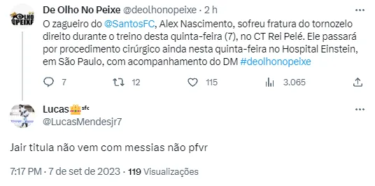 Vários comentários na web foram direcionados a Messias após a lesão de Alex. O temor de parte da torcida é que o zagueiro mais experiente seja o escolhido por Diego Aguirre, o que não agradaria o pedido popular. Mais um menino da Vila surge com a possibilidade de resolver os problemas do Peixe na temporada, algo que rola com frequência no Litoral Paulista. Jair aguarda uma chance de marcar seu nome na trajetória alvinegra.