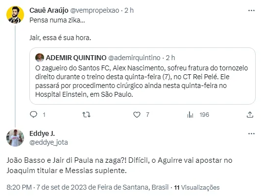 O técnico Diego Aguirre já sabia da dificuldade que o esperava quando aceitou a proposta do Santos. O treinador uruguaio busca livrar a equipe da Baixada de um rebaixamento inédito, o que ainda pesa na mente dos adeptos do Peixe. Alex, por ser canhoto, cumpria bem uma função delicada no esquema tático do time, ainda mais pela falta de reforços na zaga. Com o desfalque, o substituto já foi escolhido nas redes sociais.