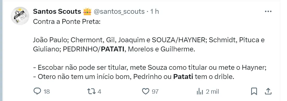 Já em seu canal no Youtube, o jornalista Fábio Sormani fez muitas críticas para o time do Santos, em especial ao treinador do Peixe. Ele questiona o fato de Weslley Patati, de 20 anos, receber poucas oportunidades.