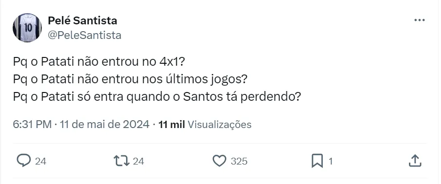 “Quando entrou foi o único cara que tentou fazer alguma coisa diferente. Por que não colocou o Patati logo no intervalo? Por que essa bronca e essa perseguição com esse menino? Não dá para entender”, opinou o comunicador.