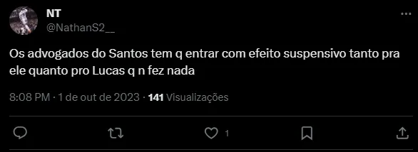 “Espero que tenham o bom-senso de tentar efeito suspensivo. Daronco errou demais nesse lance, inclusive expulsando o LL quando, na verdade, deveria expulsar jogadores do Vasco”, “É hora de tentar o efeito suspensivo, isso é inadmissível”, “Santos precisa recorrer, injusto demais o cartão” e “Os advogados do Santos tem que entrar com efeito suspensivo tanto pra ele quanto pro Lucas que não fez nada”, foram alguns dos comentários.