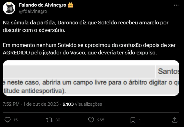 Anderson Daronco, árbitro da partida, explicou na súmula que amarelou Soteldo por ‘discutir com o adversário com a bola fora do jogo’. Os santistas não gostaram da explicação e afirmaram que o venezuelano não participou da confusão, o que o ‘livraria’ do amarelo e consequentemente da suspensão diante do Palmeiras.