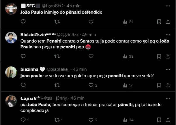 “João Paulo tem que treinar defesa de pênalti urgente“, “João Paulo, aprenda a pegar um pênalti aí meu mano“, “No dia que o João Paulo pular no lado certo de um pênalti eu já serei muito feliz” e “Oia João Paulo, bora começar a treinar pra catar pênalti, porque tá ficando complicado já“, foram alguns comentários.