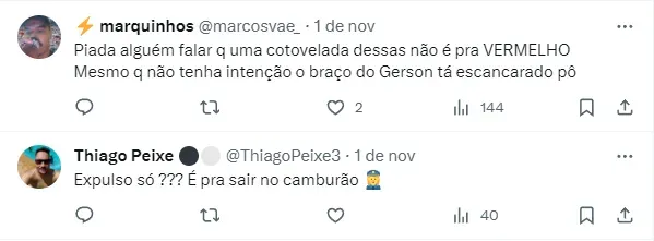 “Eu vou sugerir uma revisão para possível cartão vermelho. Ele está com o braço aberto e depois flexiona, aumentando a força da cotovelada no rosto”, pediu Rafael Rodrigo Klein em lance de expulsão de Gerson.