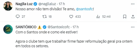 E finalizou: “O Santos tem um valor, tem exatamente a possibilidade de estar reivindicando e se posicionando com critérios para que, independente de valores que estão sendo hoje estudados, o Santos fará prevalecer, dentro da justiça e do seu direito, os valores compatíveis mesmo atuando (na Série B). São várias ações que devem ser feitas, não única e exclusivamente pensando só na questão do contrato com a nova liga.”