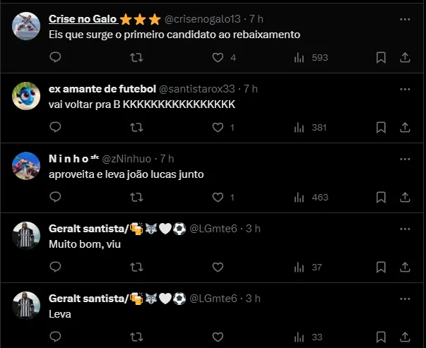 A torcida continua chateada com o inédito rebaixamento do Santos, assim, os torcedores comemoram a saída de um jogador, que na visão deles, não deveria estar no Peixe em 2023.