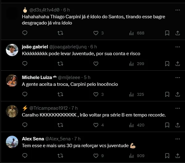 “A gente aceita a troca, Carpini pelo Inocêncio“, comentou um torcedor do Santos. O defensor não caiu nas graças da torcida, as reações são apenas de alegrias sobre o fim do contrato.