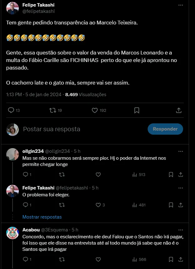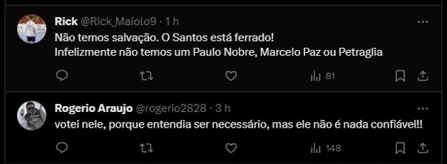 Nas redes sociais, o santistas pedem o esclarecimento do assunto, um posicionamento do Santos sobre o assunto Fábio Carille. O novo treinador assinou contrato até o final de 2024.