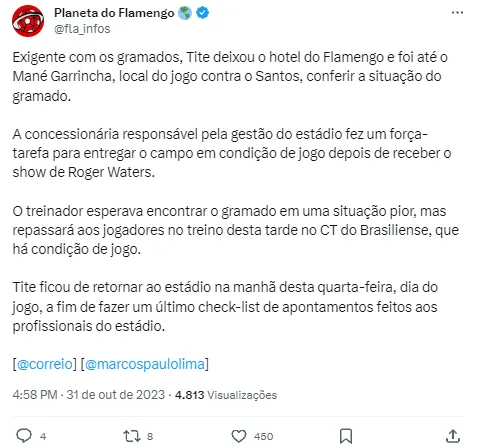 Atualmente técnico do Rubro-Negro, Tite deixou o hotel em que o Flamengo está concentrado, segundo o Correio Braziliense, e foi reconhecer o gramado do estádio. Entretanto, o treinador se surpreendeu positivamente.
