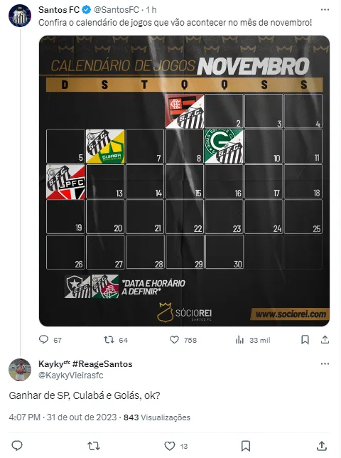 Só no mês de novembro, o Peixe encara na Série A o Flamengo, o Cuiabá, o Goiás e o São Paulo. A sequência de vitórias pode começar nesta quarta-feira (1), às 20h, no Estádio Mané Garrincha. O que pode impedir? Um empolgado Tite.