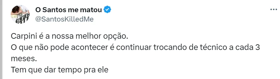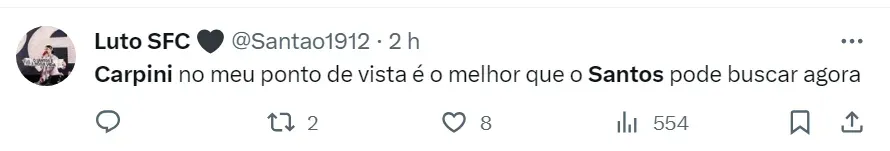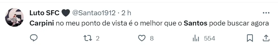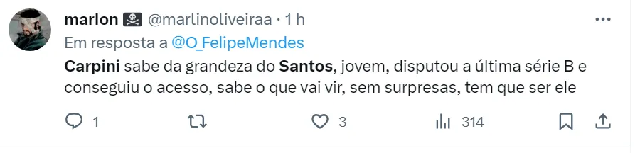 O nome de Thiago Carpini para comandar o Peixe na disputa da Série B agrada os torcedores santistas. Eles consideram o treinador o profissional ideal para recolocar o Alvinegro de volta à Série A.