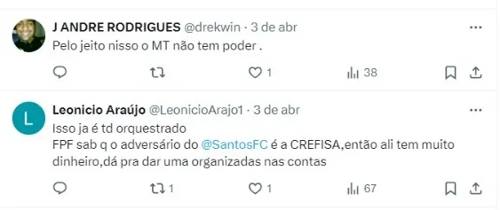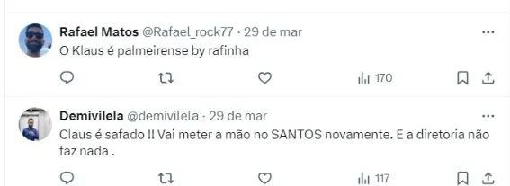 “Marcelo Teixeira precisa ser impor como Presidente do Santos e IMPEDIR o péssimo Raphael Claus de apitar o jogo. Dá tempo. É acionar o Departamento Jurídico e tomar as providências. O Santos é grande de novo ou não?“, escreveu um torcedor do Santos no X.