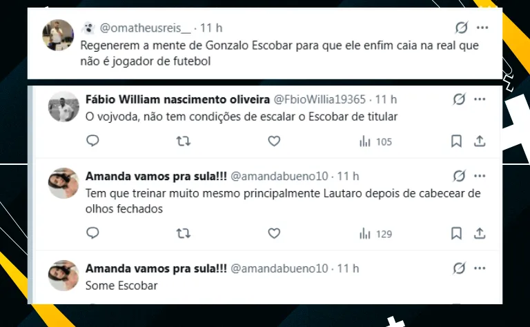 Por fim, falando mais a respeito do contrato do jogador, é importante mencionar que seu vínculo vai apenas até o final de dezembro. Isto é, ele pode assinar um pré-contrato a partir de julho com qualquer equipe. Veja alguns comentários da torcida questionando a presença de Escobar nos treinos: