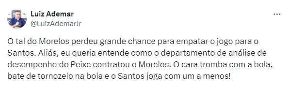 “O tal do Morelos perdeu grande chance para empatar o jogo para o Santos. Aliás, eu queria entender como o departamento de análise de desempenho do Peixe contratou o Morelos. O cara tromba com a bola, bate de tornozelo na bola e o Santos joga com um a menos”, cobrou um santista.