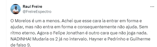 “O Morelos é um a menos. Achei que esse cara ia entrar em forma e ajudar, mas não entra em forma e consequentemente não ajuda. Sem ritmo eterno. Agora o Felipe Jonathan é outro cara que não joga nada. Nadinha! Mudaria os 2 já no intervalo. Hayner e Pedrinho e Guilherme de falso 9”, destacou um outro membro da torcida do Peixe sobre o colombiano.