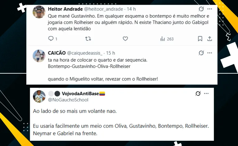 Por fim, mesmo sem ter demonstrado grande coisa até aqui em 2026, alguns santistas gostariam de ver um time com um meio-campo mais encorpado. Nesse sentido, confira pedidos por Rollheiser no time titular: