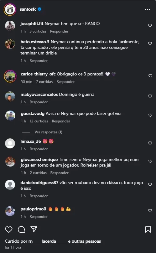 O perfil do Peixe no Instagram foi inundado de críticas ácidas sobre o artilheiro santista: “Neymar mais atrapalha do que ajuda” e “time melhorou quando ele saiu” ganharam força. Outros ainda apontaram a queda física do atacante: “Ele pensa que ainda tem 20 anos, mas não consegue terminar um drible” e “Neymar tem que ser banco”