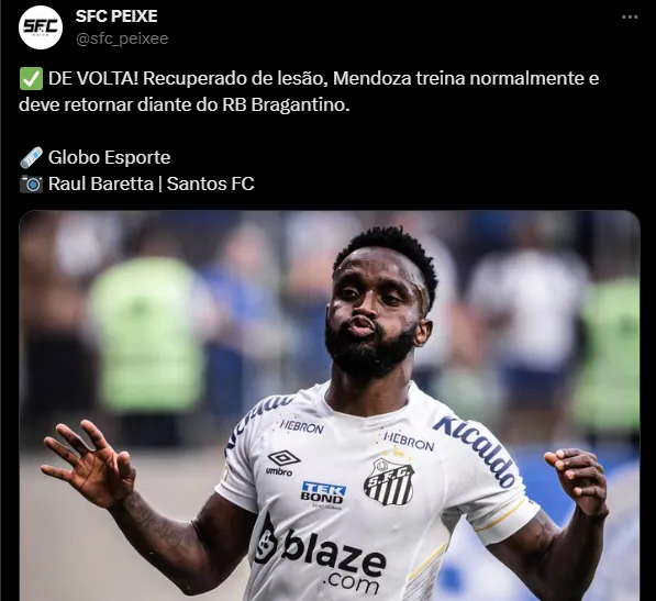 Trata-se de Stiven Mendoza, que era titular do time até se lesionar na partida contra o Cruzeiro, após sofrer um estiramento na panturrilha. O colombiano já está recuperado e briga por uma vaga com Morelos, que foi titular na vitória sobre o Palmeiras por 2 a 1, Curiosamente, depois que Mendoza se machucou, o Peixe conseguiu três vitórias consecutivas: Bahia, Vasco e Palmeiras.