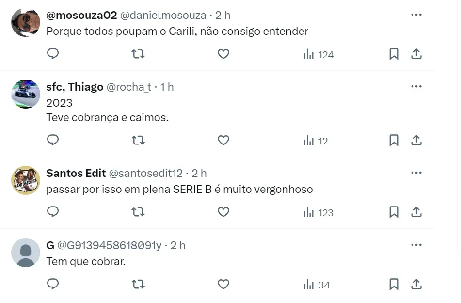 Os torcedores santistas temem que o Alvinegro não consiga retornar à elite e cobram uma reação imediata. O presidente Marcelo Teixeira, por sua vez, planeja mudanças no elenco e já liberou Cazares e Nonato.