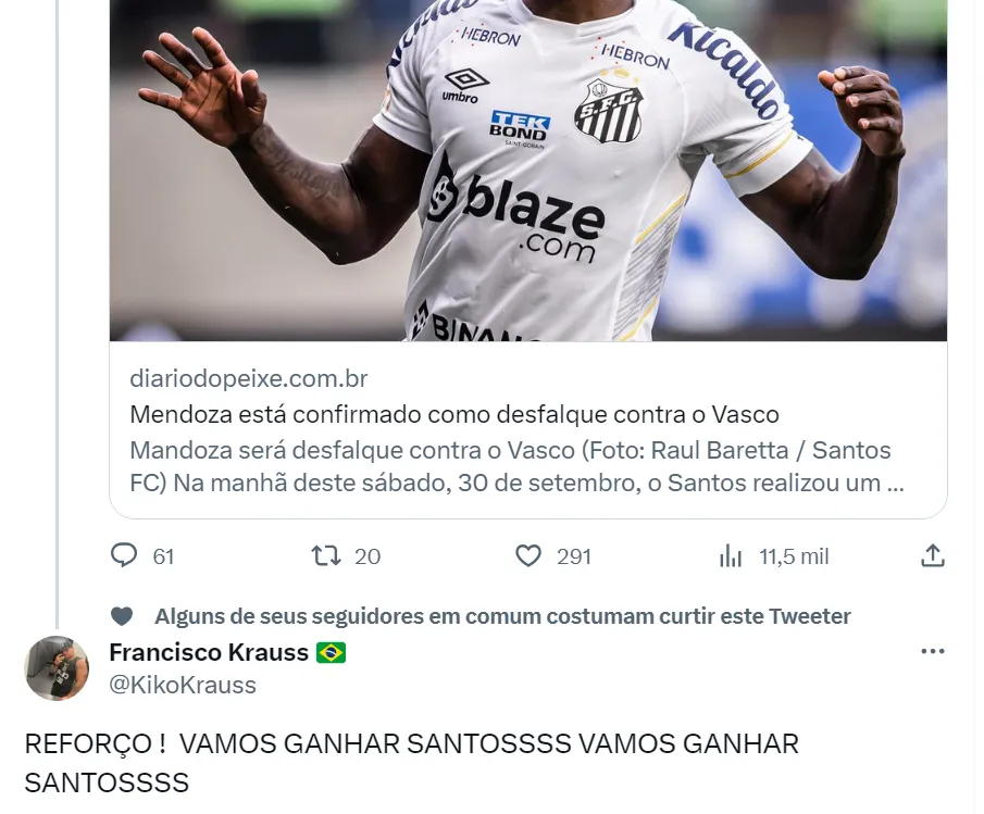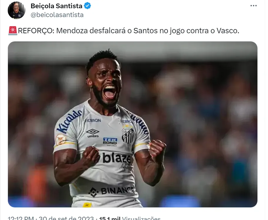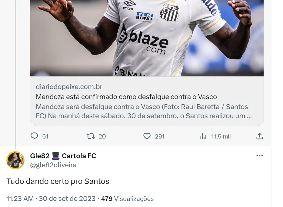 Segundo os santistas, o desfalque de Mendoza na verdade é reforço para o time (como pode ser visto nos tweets acima). Os torcedores do Santos não gostam do futebol do atacante de 31 anos, apesar dos cinco gols marcados no Brasileirão. O experiente jogador é constantemente contestado por suas atuações durante a temporada. Com Mendoza de fora, Marcelo Fernandes vai manter no ataque a dupla Soteldo e Marcos Leonardo.