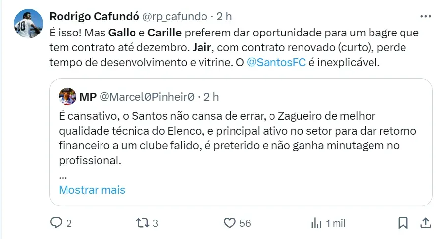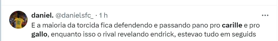 A decisão do Peixe deixou os torcedores na rede social do X muito irritados. Os santistas fizeram muitas críticas ao treinador Fábio Carille e, também para Alexandre Gallo, coordenador técnico do Clube Paulista.