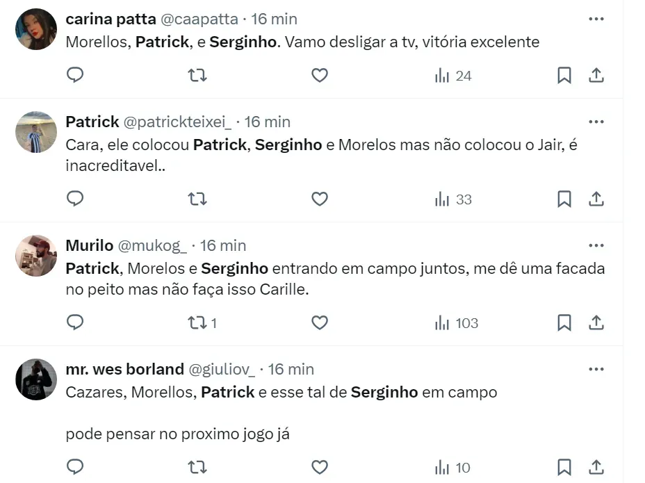 Morelos até fez um gol em passe de Chermont, já Patrick e Serginho fizeram atuações discretas. Os torcedores consideram que Carille errou e deveria dar mais chances para jovens da base.