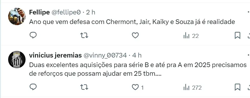 Com isso, a torcida santista fez dois pedidos para o presidente santista: as contratações do zagueiro Kaiky e do atacante Léo Baptistão. A dupla pertence ao Almería, que acabou de ser rebaixado no Campeonato Espanhol.