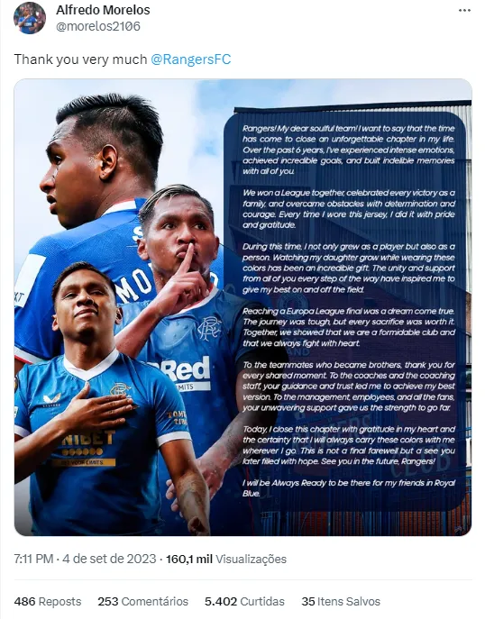 Isso porque o artilheiro soltou uma nota oficial nesta segunda-feira (4) direcionada aos torcedores do Rangers, seu último time. Em carta aberta publicada nas redes sociais do profissional, Morelos se declarou aos escoceses, exaltou a campanha do vice-campeonato da UEFA Europa League e ainda lembrou a da felicidade de ver sua filha crescendo na capital Glasgow. Em meio as lágrimas, os adeptos estrangeiros desejaram boa sorte ao colombiano.