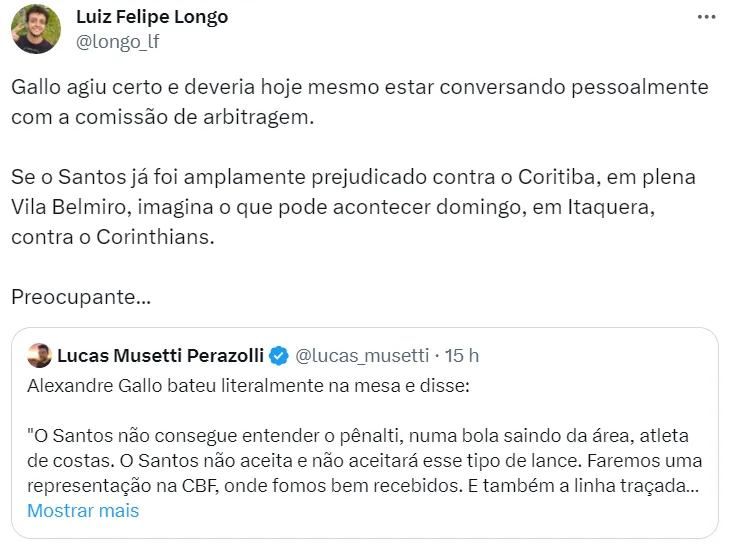 “A diretoria está fazendo de tudo, o Gallo (executivo de futebol) principalmente, amanhã (sexta-feira) a gente se concentra, se apresenta pela tarde e já fica para o jogo do Corinthians. Não vamos correr risco, uma coisa que pode ter nos prejudicado em Porto Alegre foi a viagem. Chegamos às 18h do sábado para jogar às 16h do domingo”, concluiu o técnico do Santos.