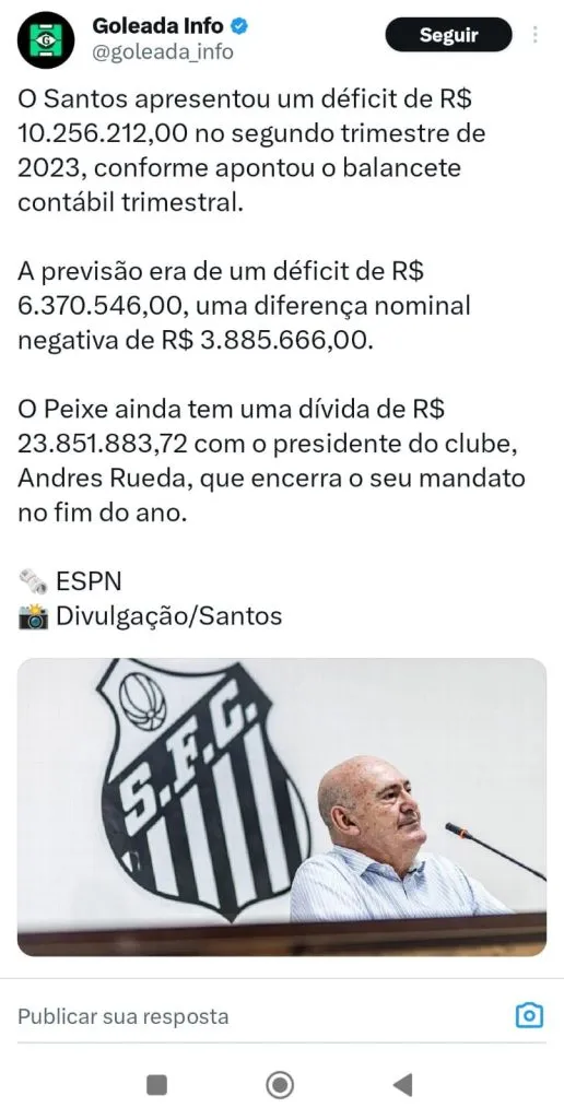 Segundo o Gazeta Esportiva, o balancete contábil do segundo trimestre de 2023, indicou que o Santos tem um “patrimônio líquido negativo de R$ 415,470 milhões, contra o valor de – R$ 404 mi no final de 2022 (ambos em situação de passivo a descoberto)”. De acordo com Rueda, ele entrega o clube com as dívidas equacionadas.