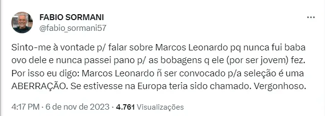 “Sinto-me à vontade para falar sobre Marcos Leonardo porque nunca fui baba ovo dele e nunca passei pano para as bobagens q ele (por ser jovem) fez. Por isso eu digo: Marcos Leonardo não ser convocado para a seleção é uma ABERRAÇÃO. Se estivesse na Europa teria sido chamado. Vergonhoso”, escreveu Sormani.