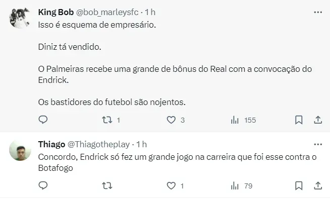No X (antigo Twitter) ele foi direto ao ponto, e criticou a escolha de Diniz por não levar o jogador. Para ele, Marcos Leonardo só não foi convocado porque não atua na Europa. Veja abaixo sua declaração.